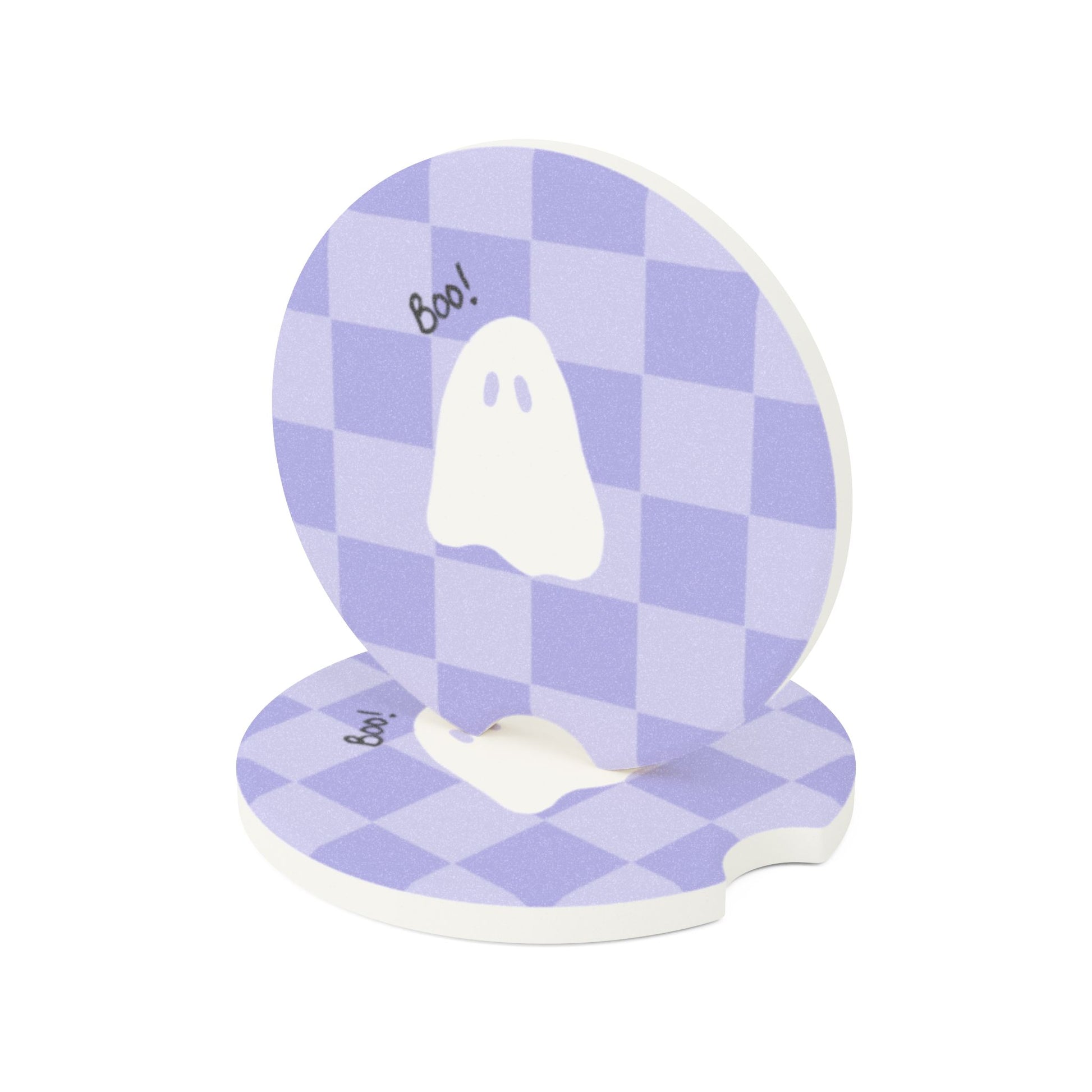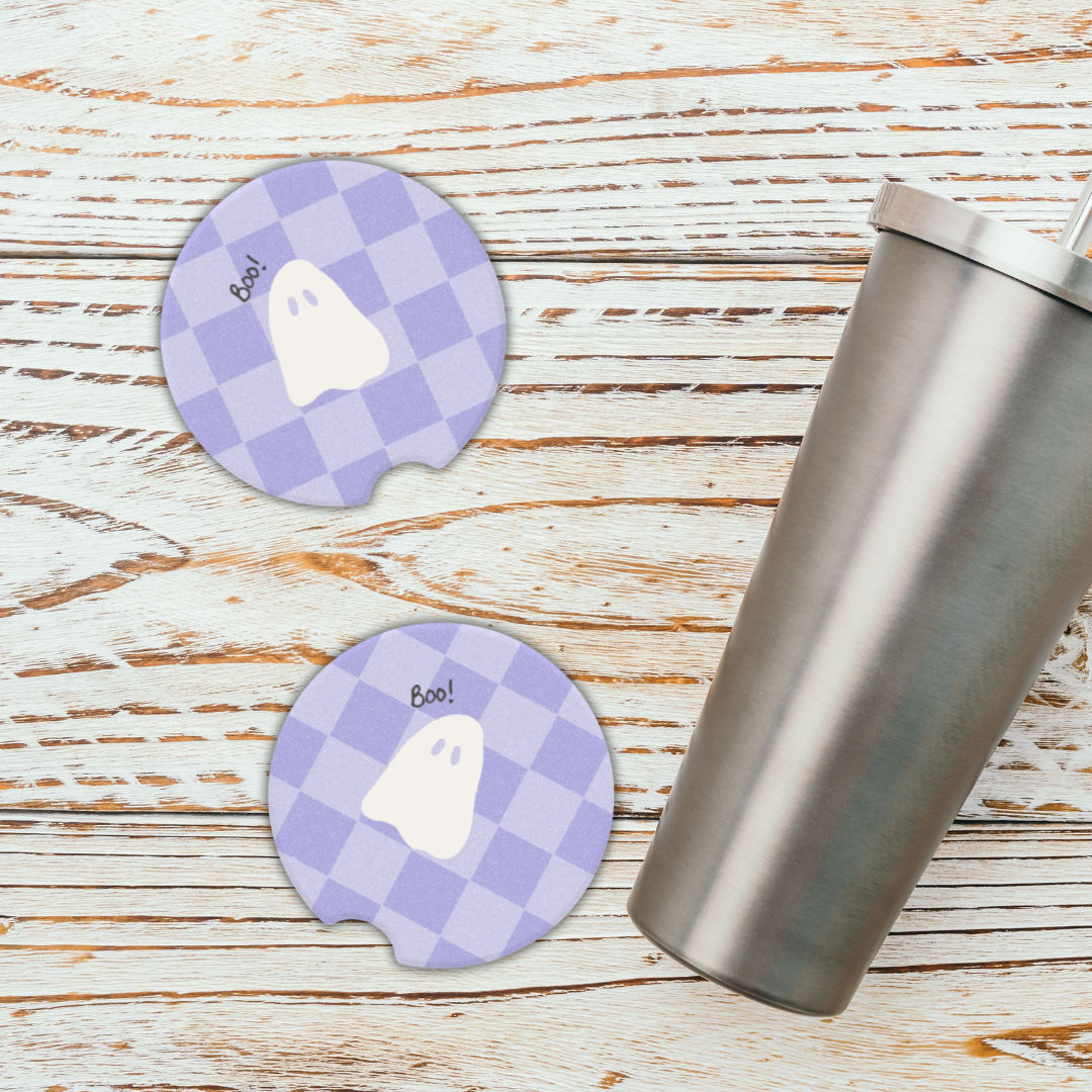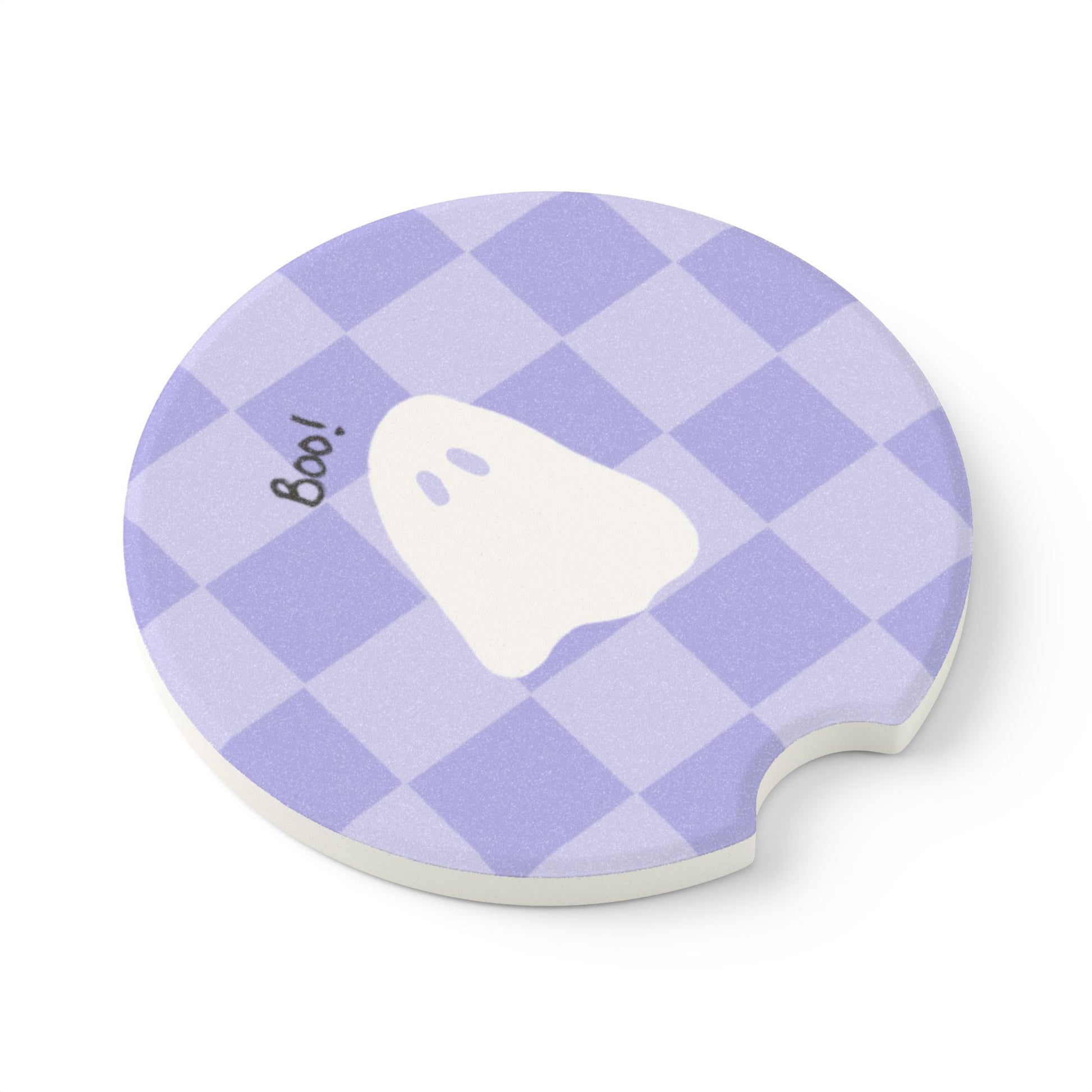 This Boo ghost retro checkered pattern car coaster adds a spooky touch to your car interior. Perfect for Halloween enthusiasts and those who love a retro vibe. Fits most vehicle drink holders. Ideal for Halloween, car enthusiasts, and retro lovers.