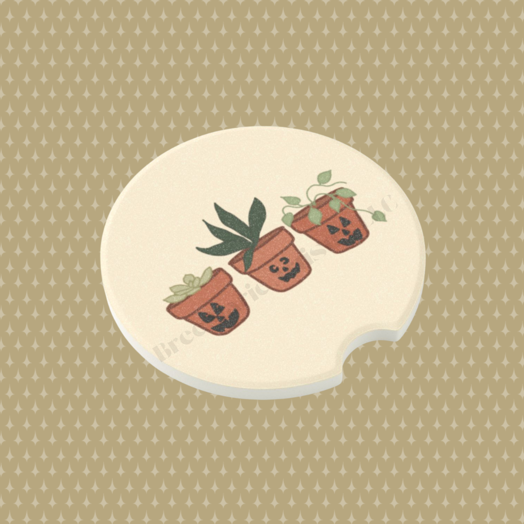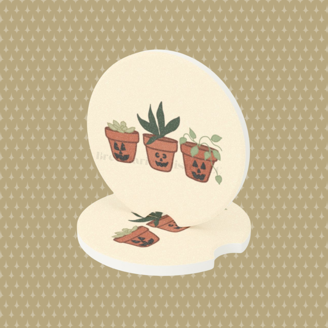 Elevate your car's interior with this set of pumpkin jack o lantern car coasters featuring terracotta pots, succulent and house plants, perfect for Halloween. Keep your cup holders clean and dry while adding a festive touch to your vehicle. Ideal for Halloween enthusiasts and anyone looking to add a touch of seasonal charm to their car decor.