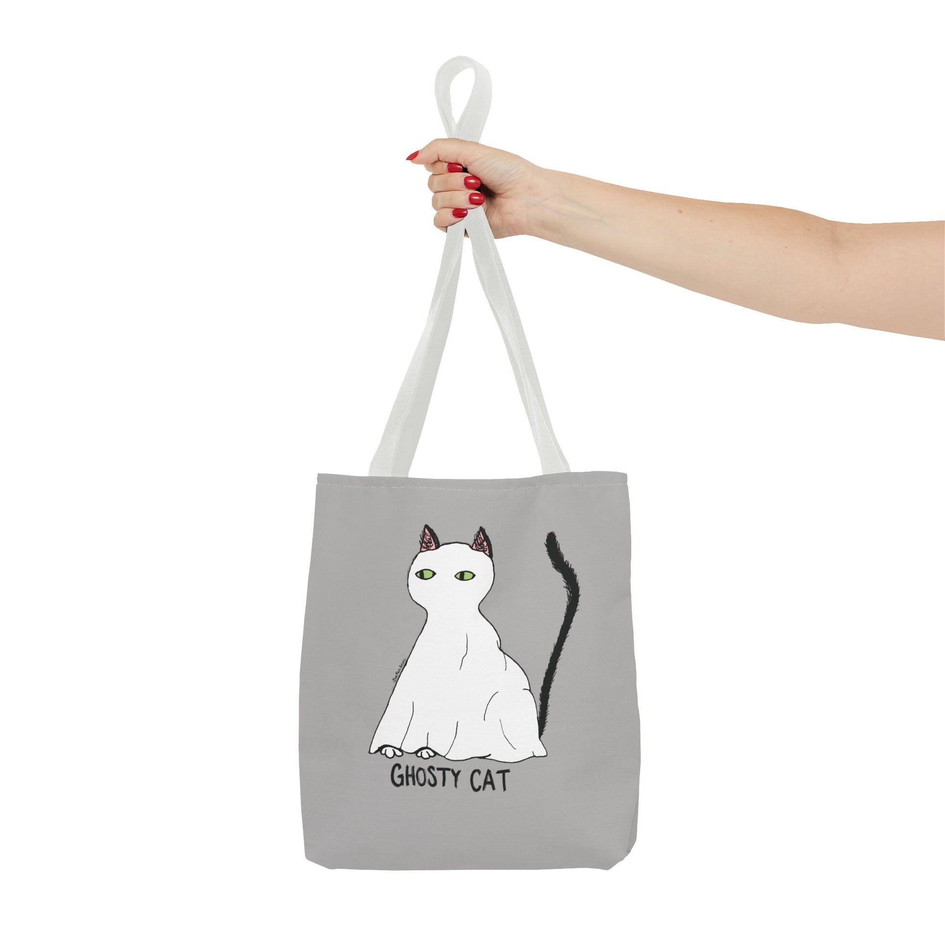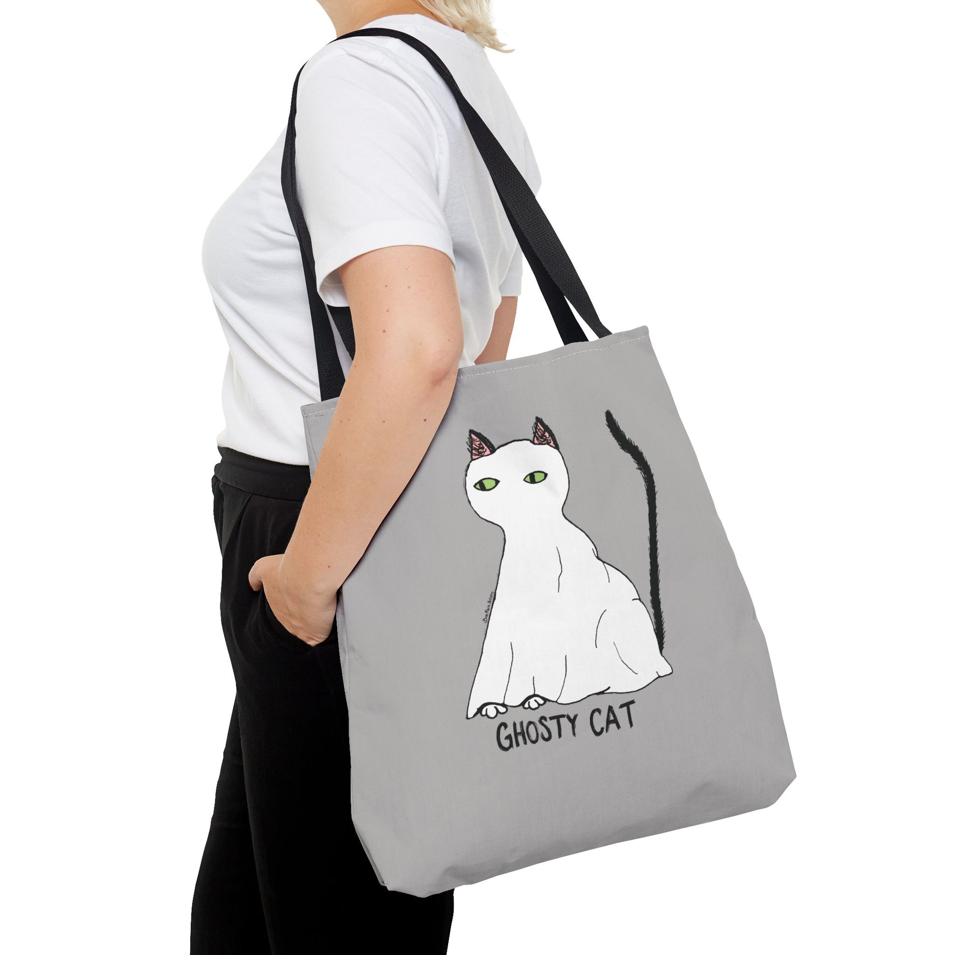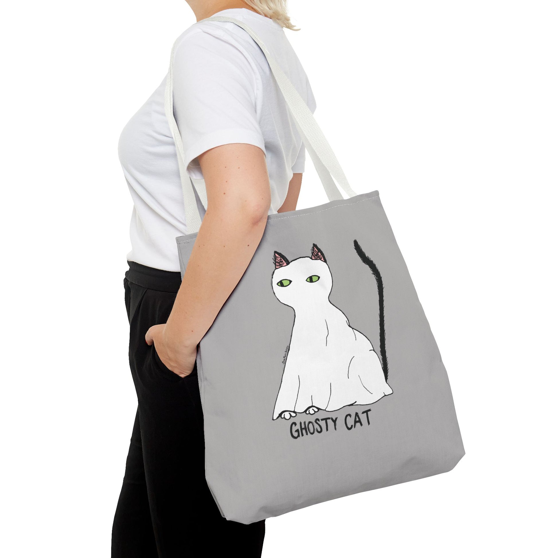 This Halloween-themed Tote Bag features an original Ghosty cat artwork, perfect for trick or treating or everyday use. Made with durable 100% polyester fabric, reinforced stitching, boxed corners, and available in 5 handle color options. Great for Halloween enthusiasts and cat lovers.