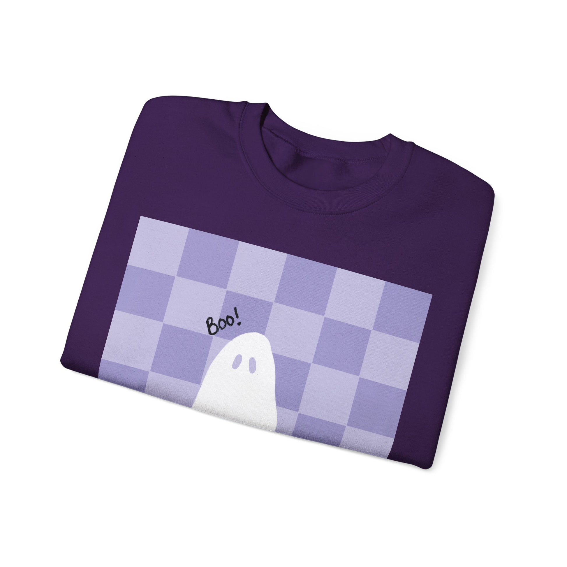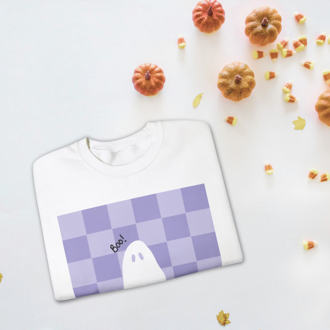 This retro boo ghost sweatshirt with a checkered pattern background gives off a cute Halloween vibe. Perfect for those looking to add a touch of spooky fun to their fall wardrobe. Ideal for Halloween enthusiasts and those who love quirky, unique clothing. Great for Halloween celebrations and themed events.